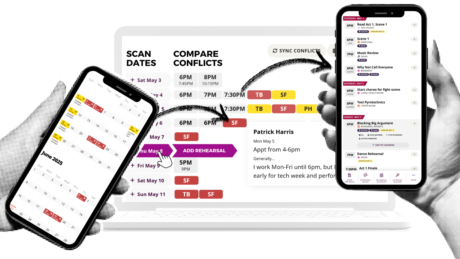 Conflict calendars sync to the rehearsal schedule software like magic 🪄, automating hours of manual data entry from your theatre production cycle.